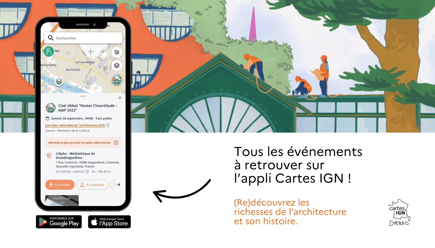 Retrouvez la programmation des Journées nationales de l’architecture 2025 dans votre poche, grâce à l’application mobile gratuite Cartes IGN. Découvrez tous les événements, tracez votre itinéraire idéal, partagez une adresse avec vos proches et changez votre parcours au dernier moment en visualisant les lieux ouverts à la visite à proximité. Chaque lieu fait l’objet d’une description détaillée avec toutes les informations pratiques (coordonnées, horaires et inscription) et peut être partagé par message avec ses proches afin de se retrouver plus facilement.